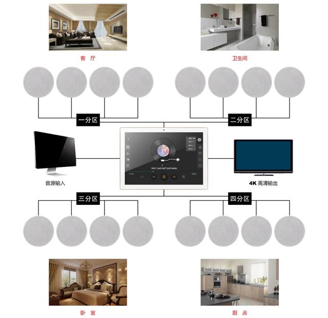 背景音乐包括智能背景音乐主机和吸顶喇叭,喇叭可以选配多个,每个房间均可设置。在任何一个房间内,包括客厅、厨房、卧室、卫生间均可布上背景音乐线,通过一个或多个音源,让每个房间都能听到美妙额音乐。