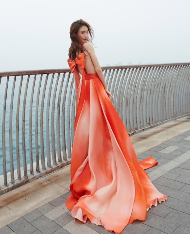 红色很衬肤色,配上红唇更具妩媚风情,上半身的亮片元素显得更加闪亮耀眼,柔美的裙摆十分飘逸,加上后背的蝴蝶结更显梦幻浪漫气息,优雅迷人。